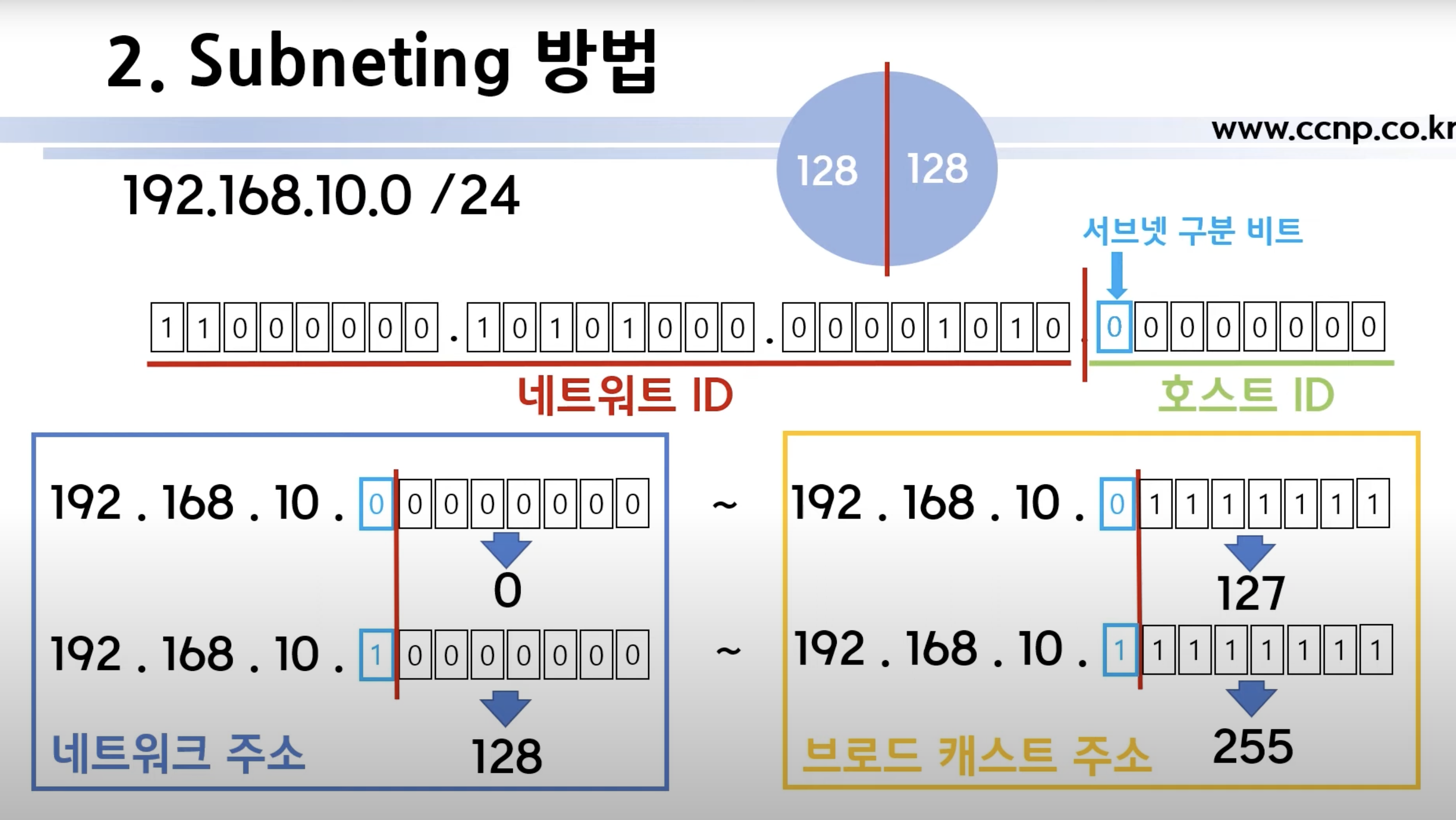 호스트 ID에서 가장 왼쪽의 한 비트를 서브넷 구분 비트로 설정하였을 때, 서브넷 구분 비트가 0일 경우에는 호스트 ID는 0 ~ 127까지 가능할 것이고 1인 경우에는 128 ~ 255까지 가능하다.