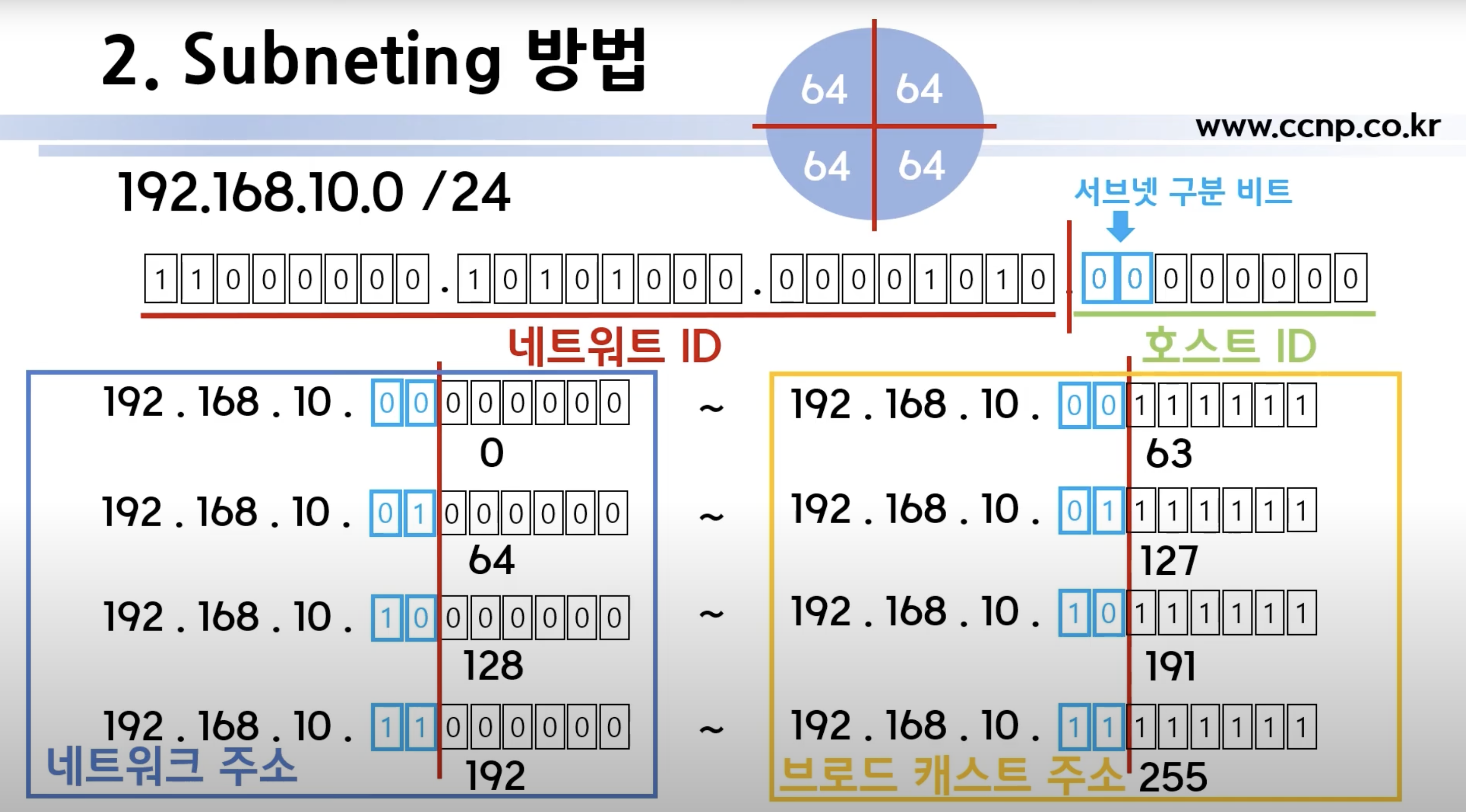 만약 서브넷 구분 비트를 두 개의 비트로 설정할 경우에는 다음과 같이 분할이 가능하다.