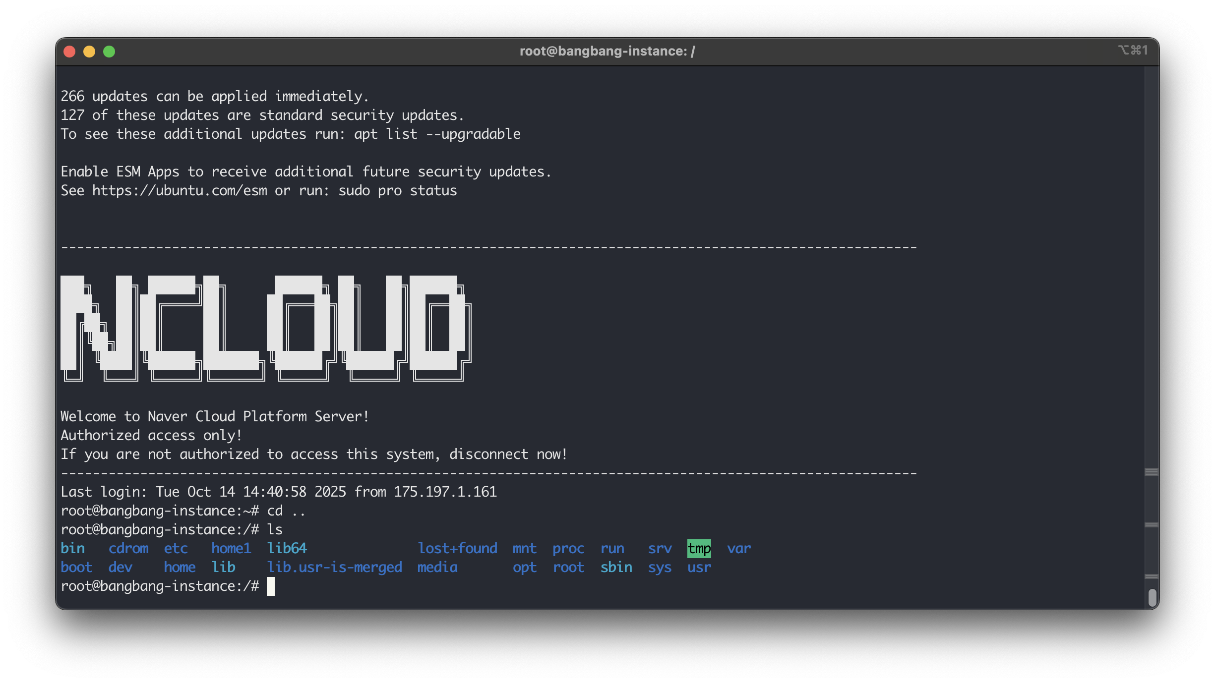로컬 터미널에서 ssh -i <pem 키 경로> <계정>@<주소>를 통해 접속을 시도하였고 성공적으로 접속할 수 있었다.