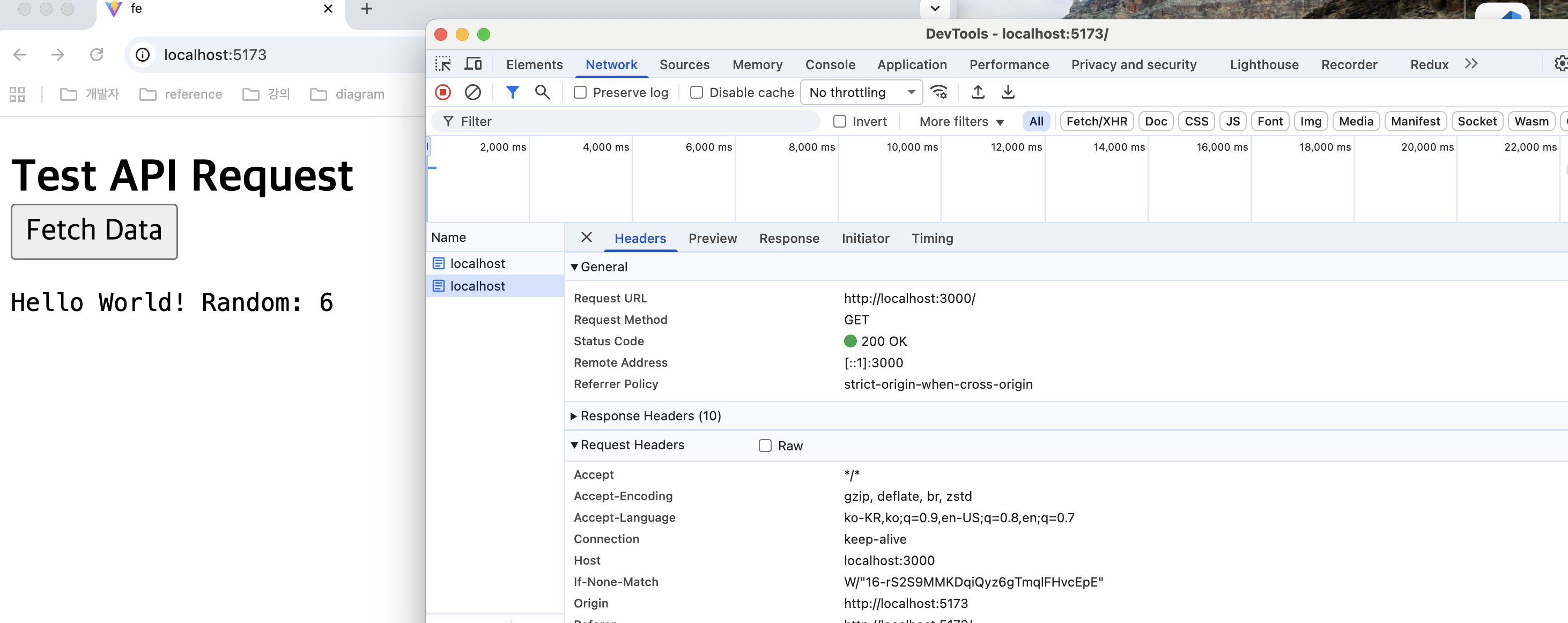 성공적으로 로컬에서 FE와 BE를 연동하여 데이터를 요청하고 응답할 수 있게 되었다.