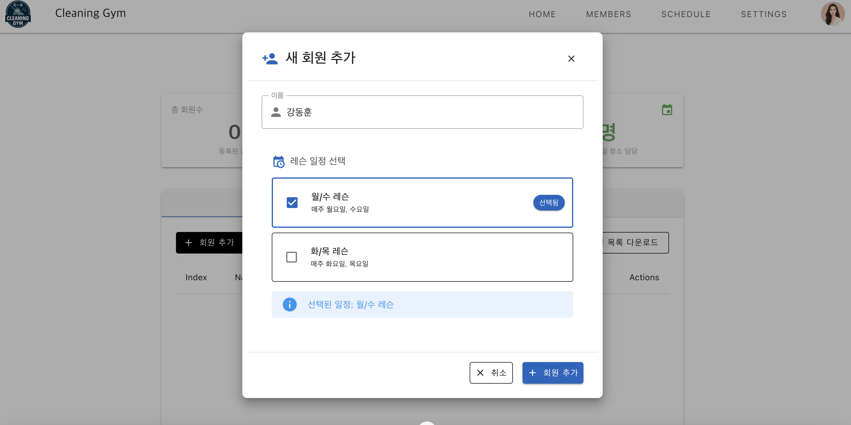 - 월/수 레슨 회원은 월 혹은 수요일에 청소를 수행한다.