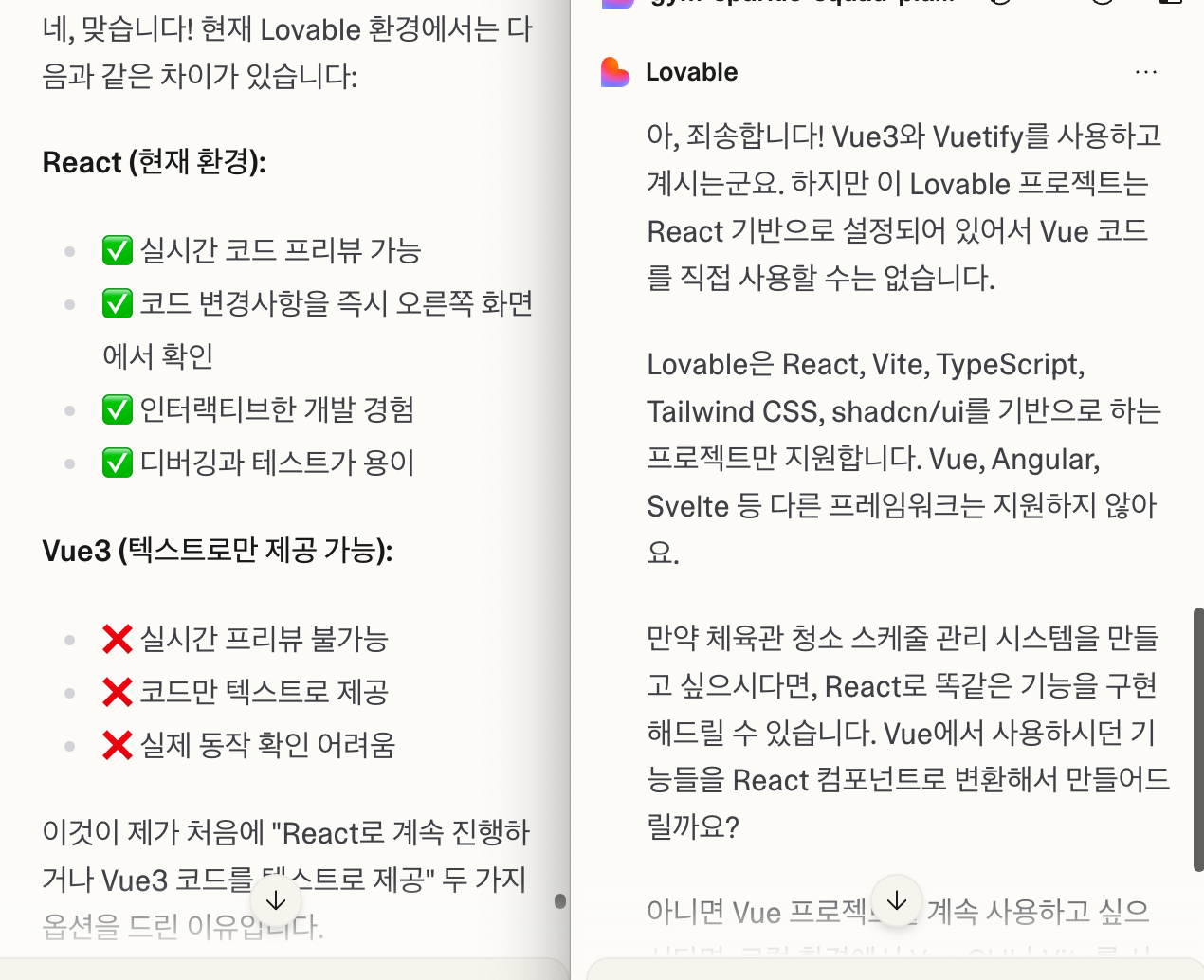 둘 다 내가 원하는 작업을 온전히 진행할 수가 없었기에, Lovable과 stitch를 통해 원하는 디자인이 나올 때까지 돌려보고 괜찮은 디자인이 나오면 해당 코드를 Claude에게 던져서 Vue 코드로 변환하게끔 작업하였다. 어찌보면 AI 돌려막기,,