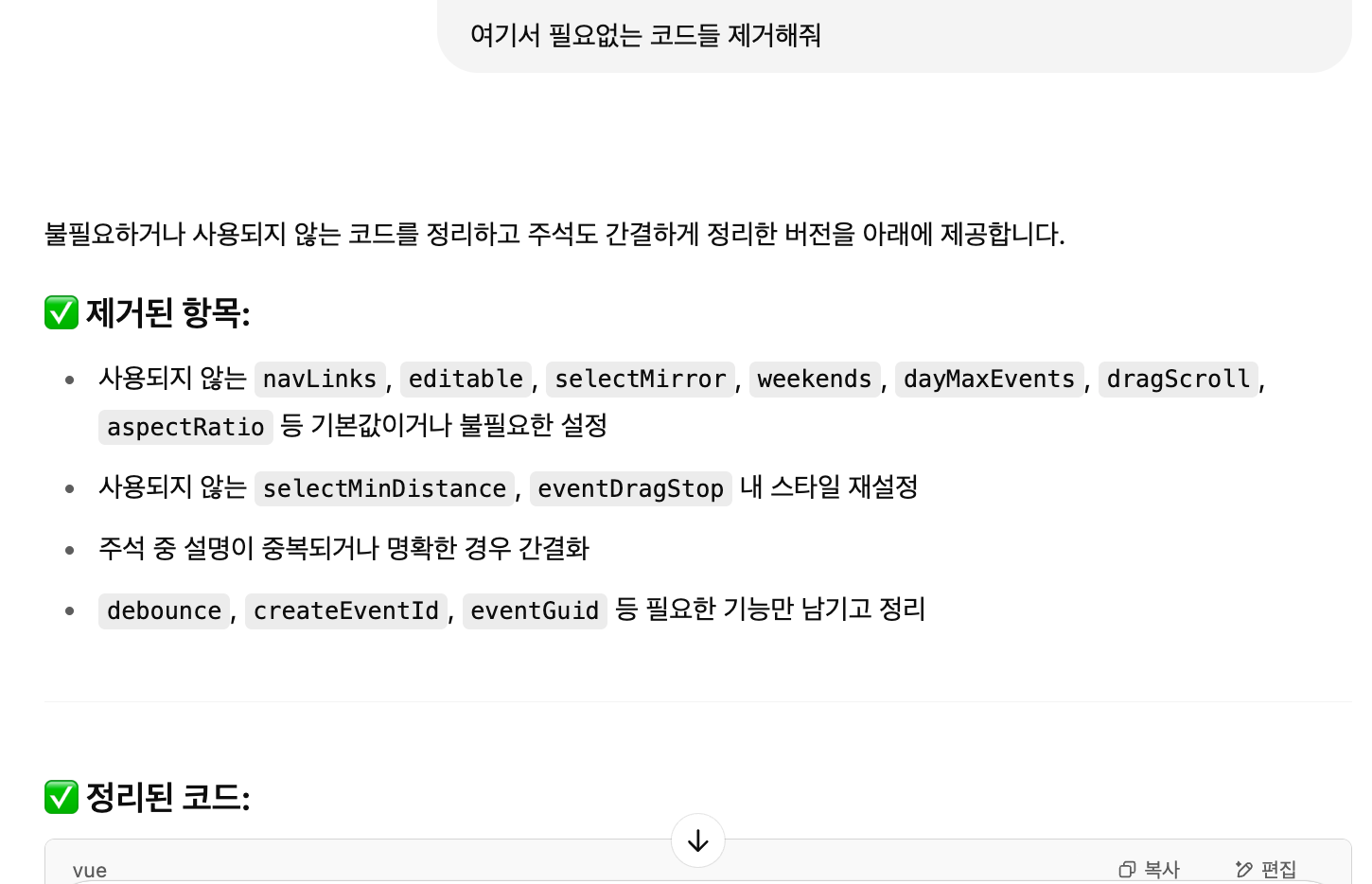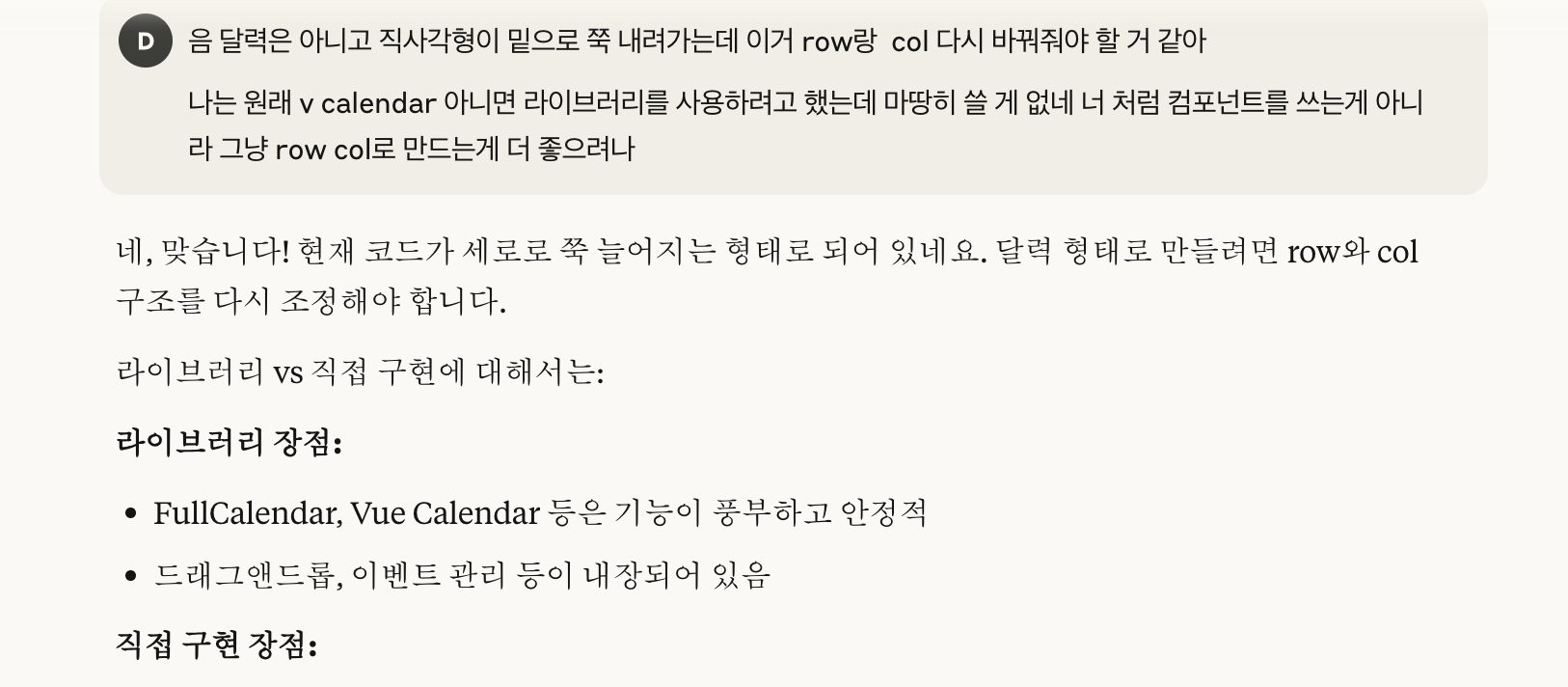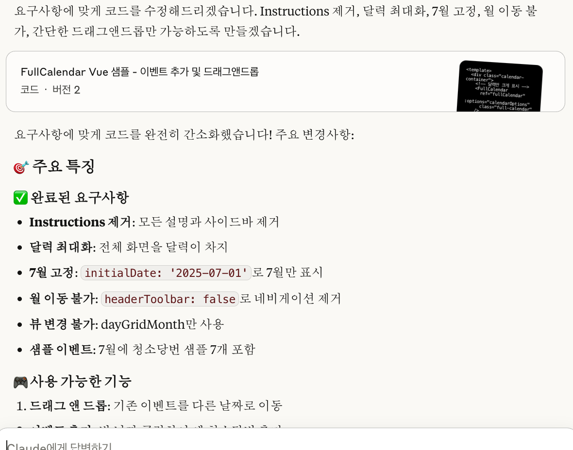 공식 페이지에서는 다행히도 데모 페이지나 샘플 코드들을 제공해주고 있어서 Claude를 통해 vue 코드로 변환시켜주었다. 샘플 코드는 해당 컴포넌트를 표현하는데 최적화된 코드고 AI는 이미 이전 프롬프트를 통해 나의 프로젝트 내용을 인지하고 있기 때문에 캘린더 컴포넌트를 내가 원하는 방식으로 샘플 데이터와 함께 코드를 작성할 수 있었다.