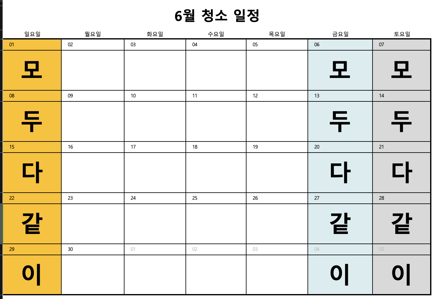 - 청소는 월,화,수,목 진행하며 금,토,일은 모두 다 같이 청소를 한다.