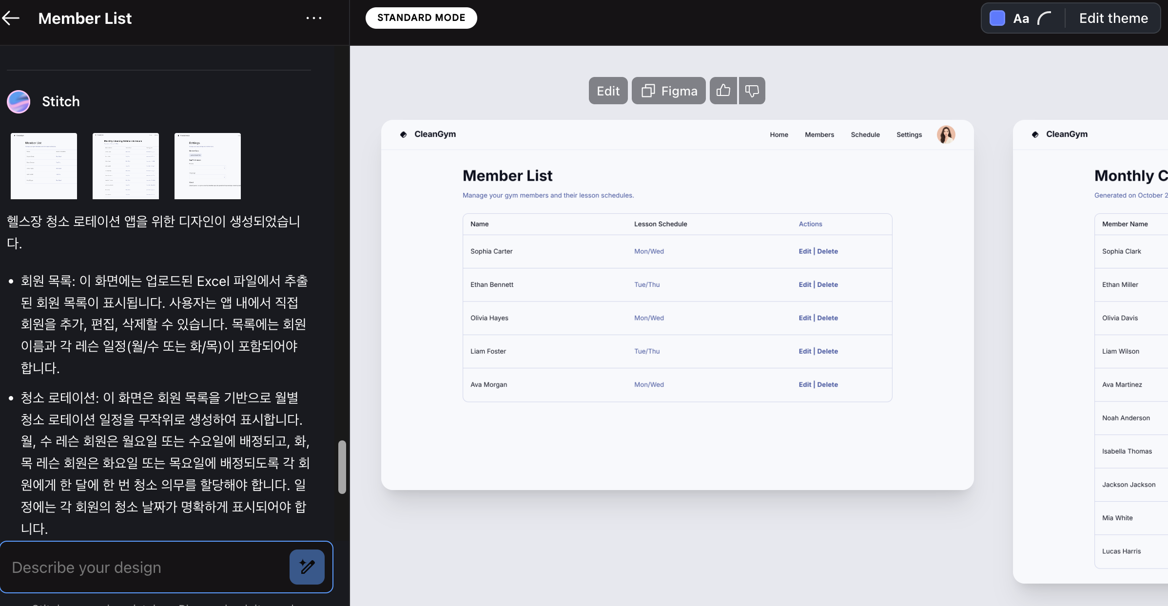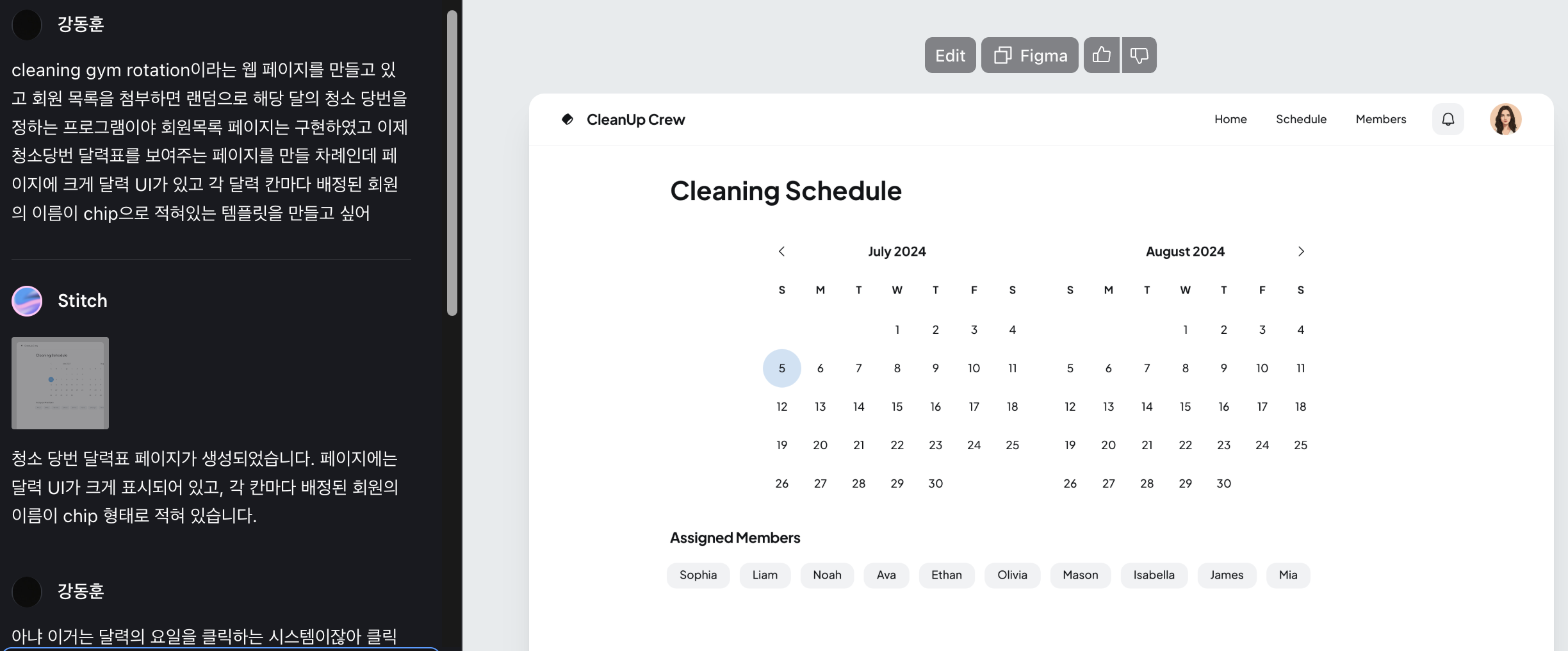 Stitch는 Beta 버전이라 그런가, 프롬프트에 대한 이해도가 조금 떨어지기도 하고 아직 학습이 덜 된 것 같은 느낌이 들었다. 예를 들어, 내가 원했던 UI는 큰 캘린더에 각 일자마다 회원명이 Chip 형태로 들어가 있는 디자인이었는데, 계속에서 일자를 선택만 할 수 있는 캘린더 컴포넌트를 생성해주었다. 물론 성격이 급한 탓에 프롬프트를 대충 작성하기도 하였지만 서너 번 설명해도 디자인이 변경되지는 않았다.
