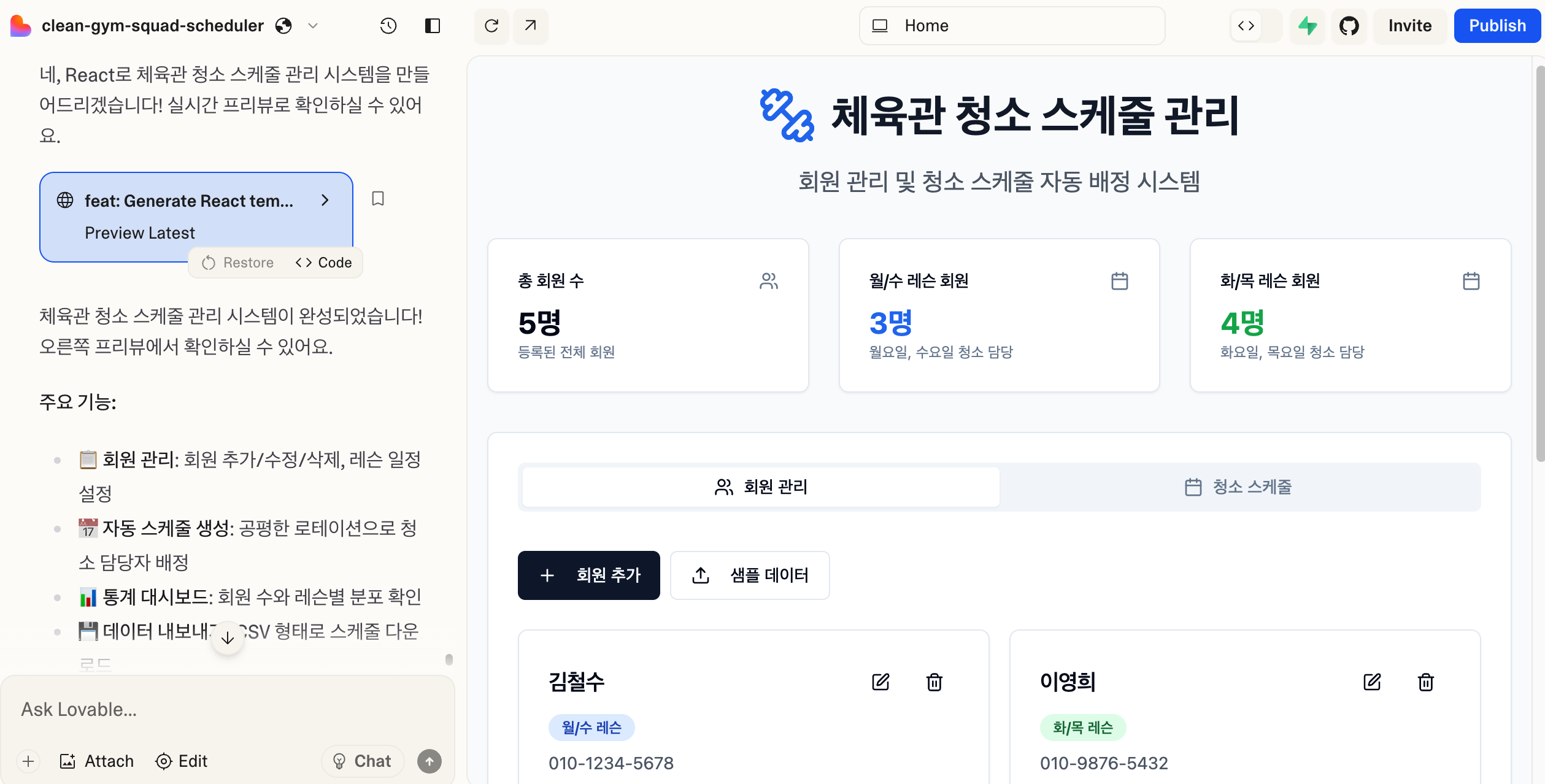 기존에는 /schedule 경로를 추가하여 하나의 페이지에 Full Calender 컴포넌트를 표시할 생각이었지만 Lovable 에서 제공받은 템플릿에서 회원관리와 청소 스케쥴을 tab으로 제공하는 것이 인상깊어서 전체적인 페이지의 틀을 변경하였다.