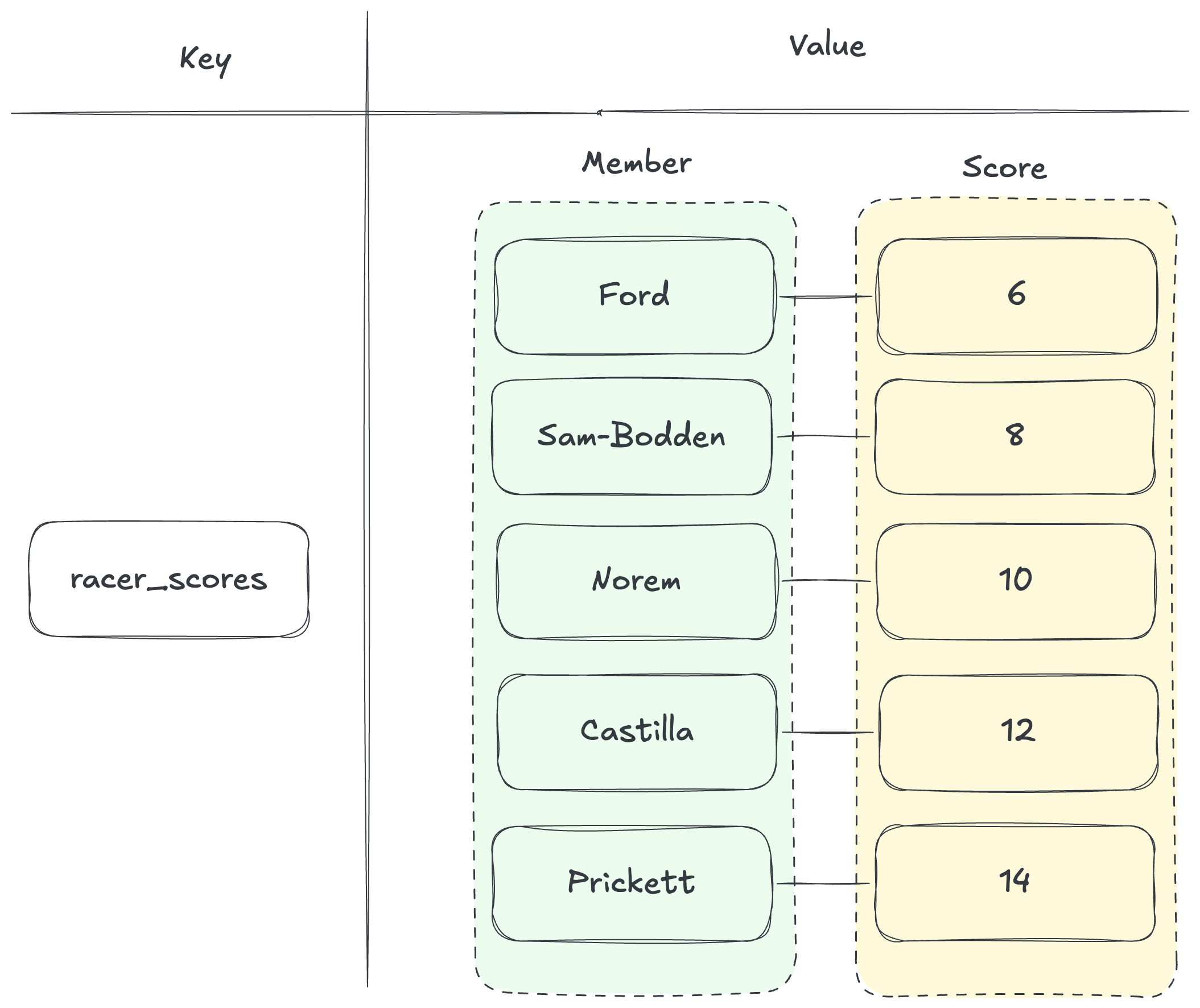 const res3 = await client.zAdd('racer_scores', [ { score: 8, value: 'Sam-Bodden' }, { score: 10, value: 'Royce' }, { score: 6, value: 'Ford' }, { score: 14, value: 'Prickett' }, { score: 12, value: 'Castilla' } ]); console.log(res3); // >>> 4