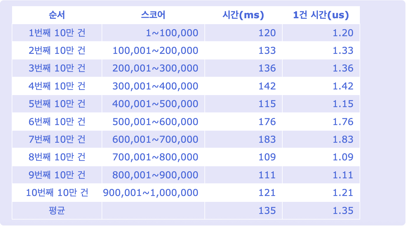 이렇게 정렬된 데이터를 저장하기 위해 Skip List 자료 구조를 활용하여 대부분의 연산에서 일정한 시간 복잡도 (O(log n))을 유지하기 때문에 다음과 같은 결과를 보여줄 수 있다.