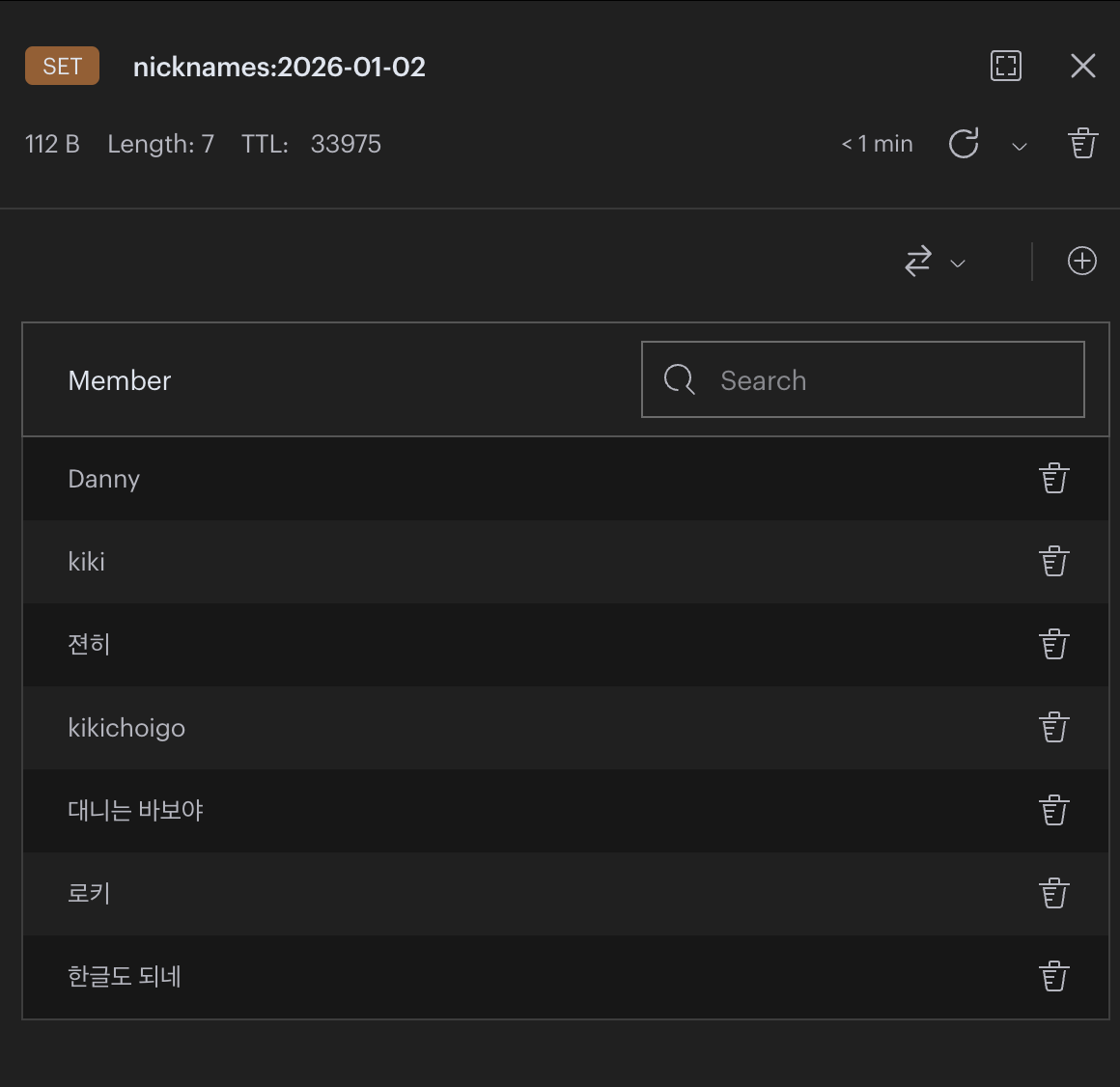 이를 위해 레디스에서 제공하는 Set 자료구조를 이용하여 하루에 생성된 닉네임 리스트를 저장하도록 설계하였다.