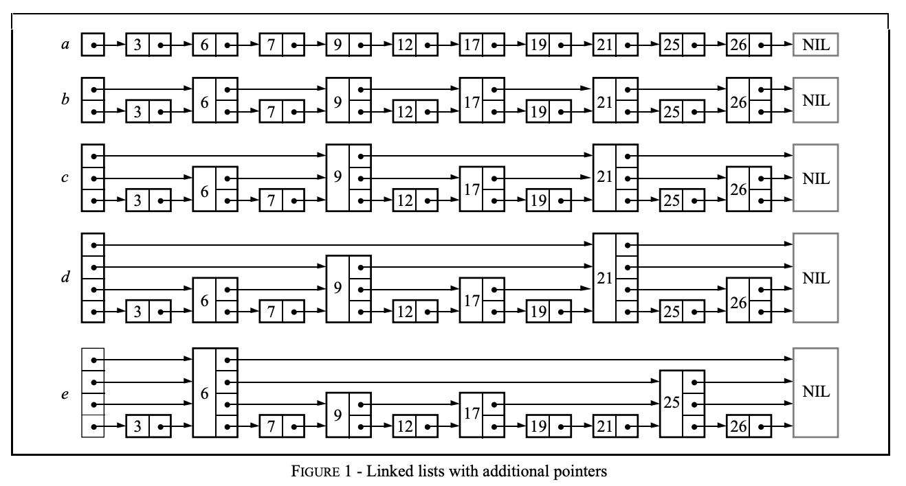 하지만 만약 건너 뛸 수 있는 포인터를 추가한다면 조회의 성능은 더 빨라질 수 있을 것이다. 예를 들어, b 리스트와 같이 2개의 노드마다 포인터를 가리키는 리스트를 하나 더 추가하면 최대 [n/2] + 1의 노드만 검사하면 조회가 가능할 것이다.