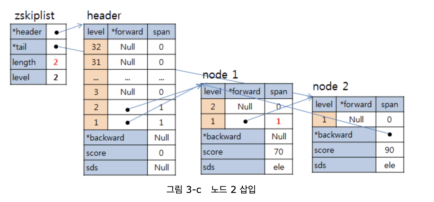 zskiplistNode에서는 이전 노드를 가리키는 backward 포인터를 저장하며 각 레벨마다 다음 노드를 가리키는 forward 포인터와 그리고 다음 노드까지의 개수를 저장하는 span으로 구성되어 있다.